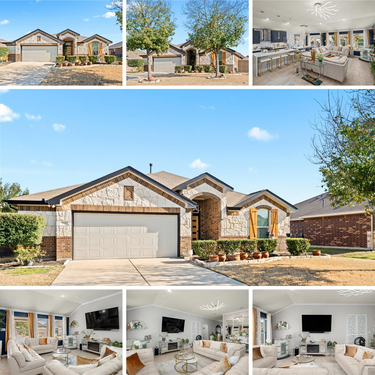 Welcome to this dream rental! This beautifully updated home in the heart of Kyle offers designer touches, a flowing open layout, and an unbeatable location in a peaceful south of Austin suburb. Step inside and be greeted by a sophisticated living space, elegant accent lighting perfect for cozy evenings. The large windows and bold navy accent wall create a bright, inviting atmosphere with plenty of natural light. The kitchen is a true showstopper. With sleek, high-gloss navy cabinetry, stunning quartz countertops, and a waterfall-edge island, this space is both functional and glamorous. Gold hardware, modern pendant lighting, and bar seating add a touch of luxury. The adjacent dining area includes a custom statement chandelier and looks out to the covered patio — great for indoor-outdoor living. Additional highlights include an open-concept floor plan with stylish finishes throughout, a neutral tile flooring for easy maintenance, fully equipped kitchen with stainless steel appliances, spacious bedrooms and updated baths.A private backyard with patio lighting and room to relax and entertain. Located in a quiet friendly neighborhood in Kyle, this home offers easy access to I-35, local parks, shopping, dining, and a short commute into Austin. Available now – don’t miss this one-of-a-kind rental!